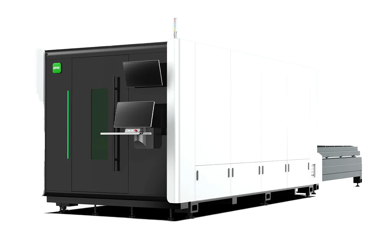 The AORE PU Series is a fully enclosed, high-speed fibre laser with exchange table, delivering 180 m/min cutting speed and 50–80% higher production efficiency.