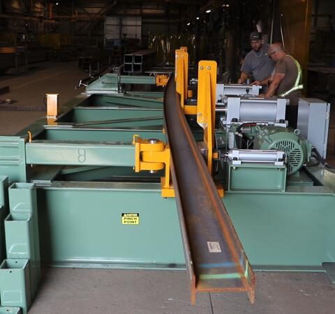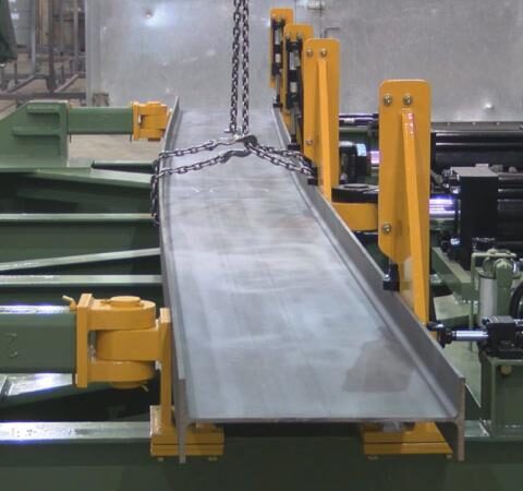 Powered rollers with lift, so beam can just go through the line without being lifted off by crane.